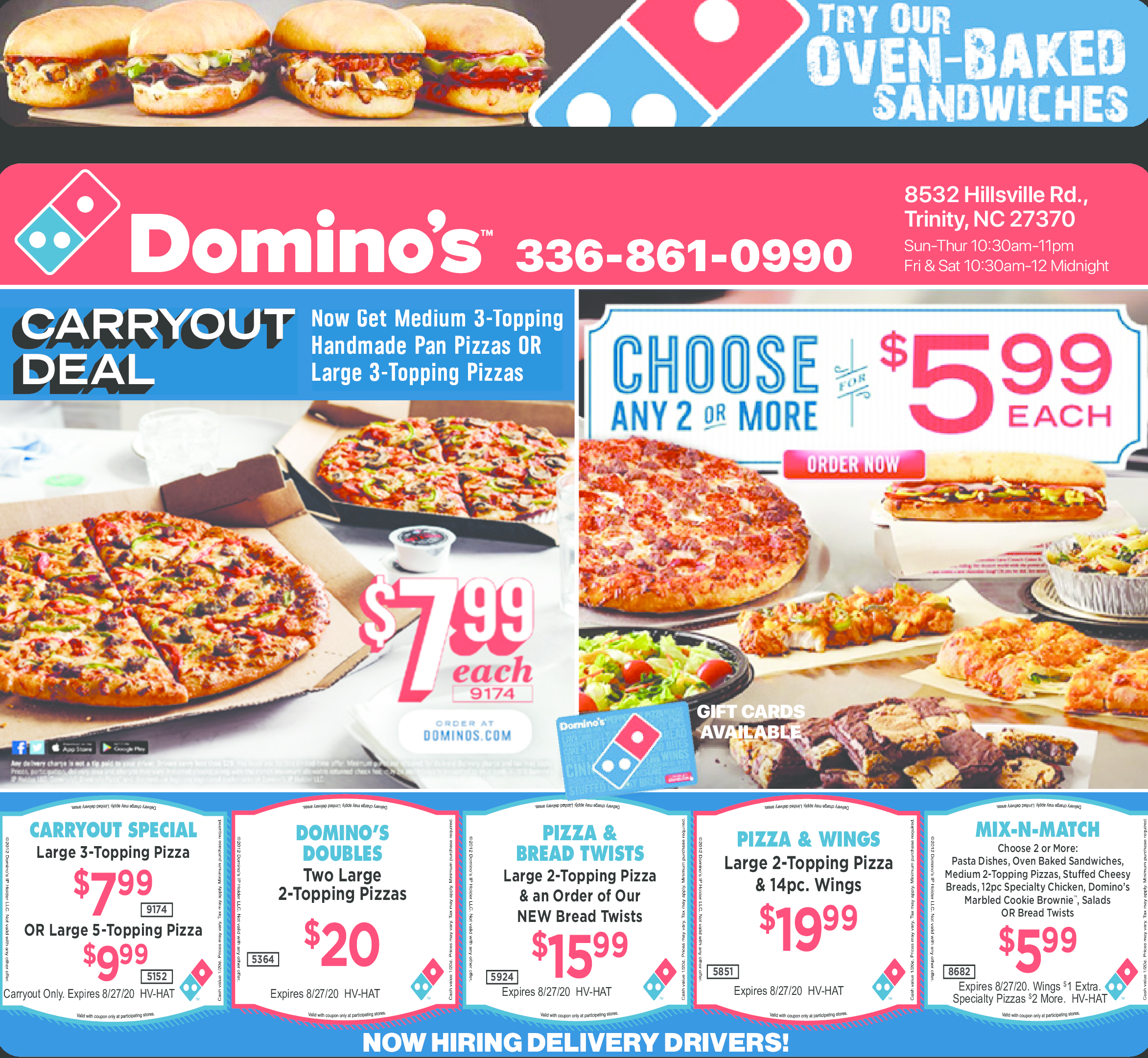 Domino's Deals For August 2022 - Savewall Here's this month's selection of Domino's Coupons & Deals. Domino's Deals: $5.99 Mix & Match Deal You can choose 2 or more items for $5.99 only ($6.99 for delivery orders). You can choose from the following items: Medium 2 topping Pizzas, Bread, Salads, Chicken, Sandwiches, Pasta, and desserts. Domino's Deals: $7.99 Carry-out